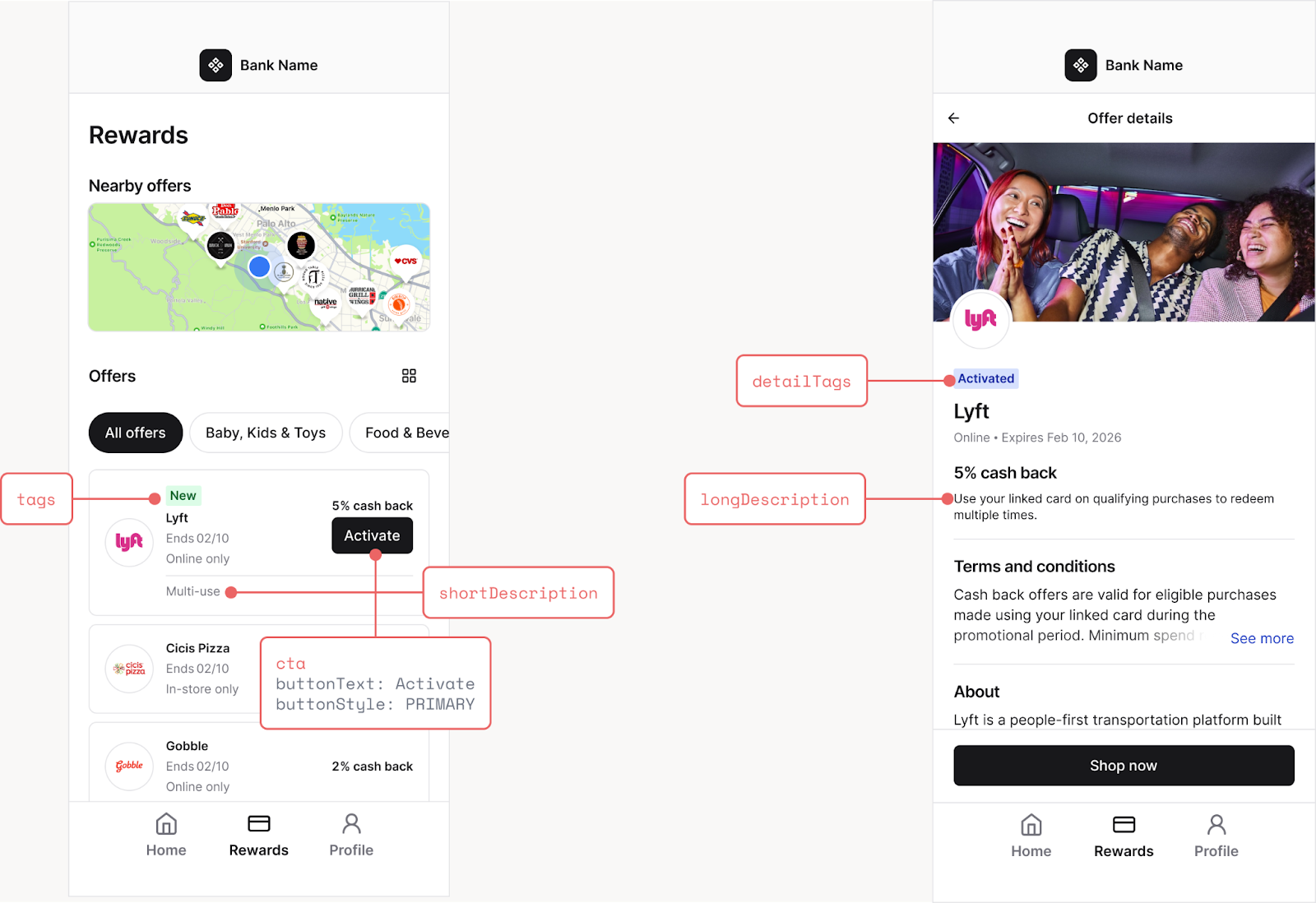 - tags / detailTags, contextual labels for browse and detail views, so you don’t have to compute the offer state to figure out what label to surface. For example, “New,” “Activated,” or “5 days left.”